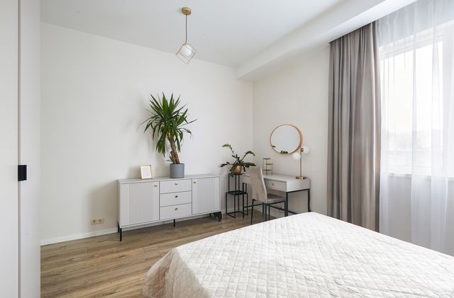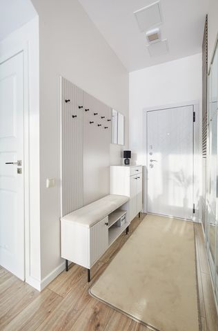 Langai plastikiniai su stiklo paketais. Sienos išlygintos ir nudažytos. Grindų danga – laminatas ir plytelės. Šarvuotos lauko durys. Pilnas baldų apstatymas: virtuvinis komplektas, elektrinė kaitlentė, bei orkaitė su mikrobangų krosnelės funkcija, šaldytuvas, indaplovė, skalbimo mašina ir kietieji, bei minkštieji baldai.