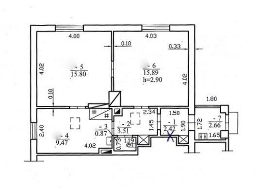 Išplanavimas: kambariai 15,89 kv.m. ir 15,80 kv.m., virtuve 9,47 kv. m., holas, wc.