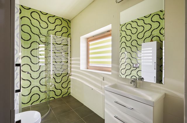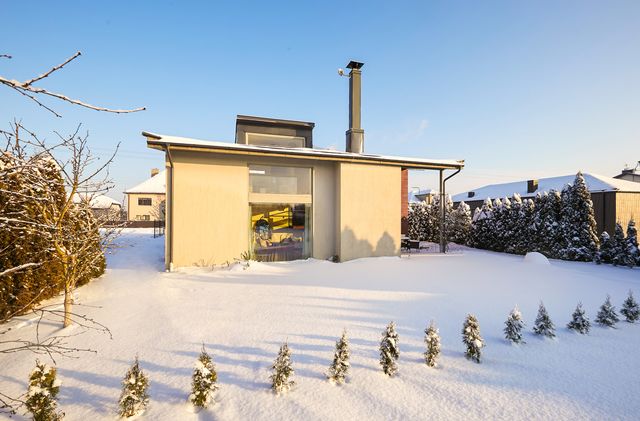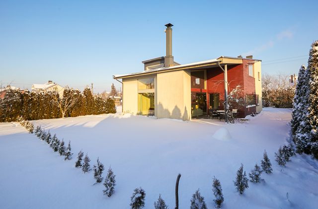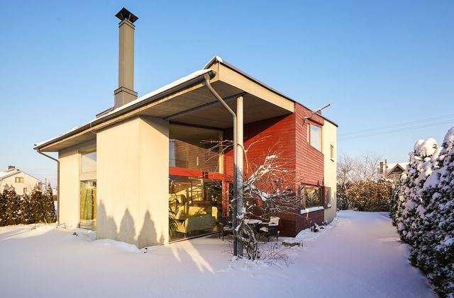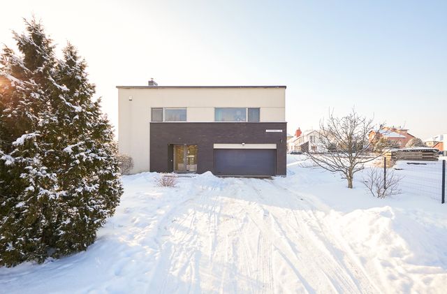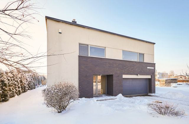Namo projektas nekartotinis – individualus – tai yra kito tokio namo daugiau nėra. 2005 m. statyba, mūro blokeliai. Namo sienos apšiltintos, išorės apdaila struktūra, klinkerio plytelės ir medžio dailylentės. Stogas – skarda, apšiltintas akmens vata, ant namo stogo sudėtos saulės baterijos panelės. Visos miesto komunikacijos. Elektra (trifazis), įrengta 10kw saulės elektrinė ir buitinė stotelė automobilių pakrovimui garaže. Vanduo - miesto, kanalizacija – miesto. Šildymas autonominis dujinis – pirmas aukštas grindinis arba sumontuoti radiatoriai į grindis, antras aukštas sanmazguose grindinis, miegamuosiuose radiatorinis. Taip pat name įrengtas kondicionierius – vasarą vėsina, žiemą šildo.