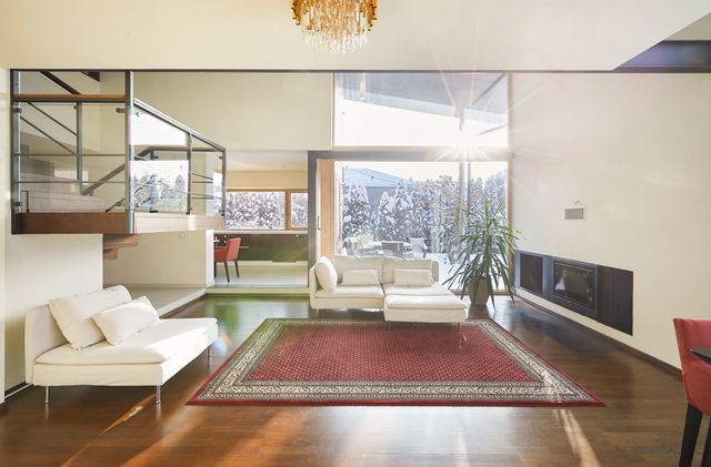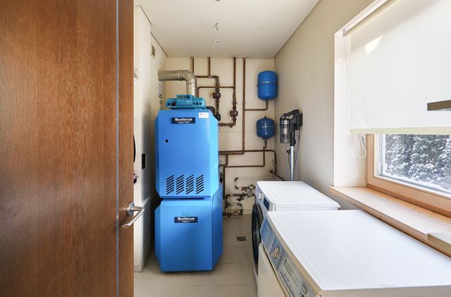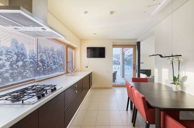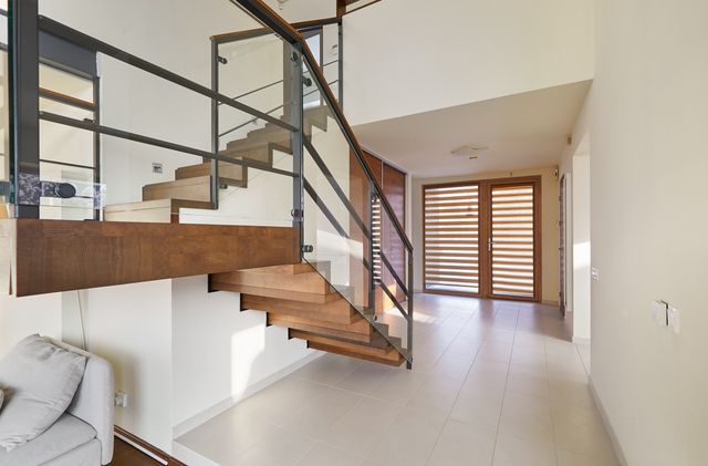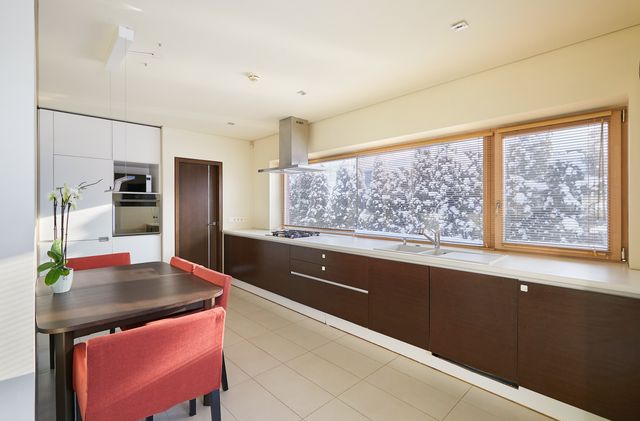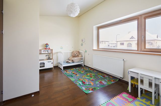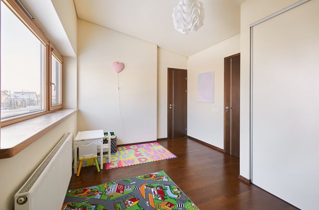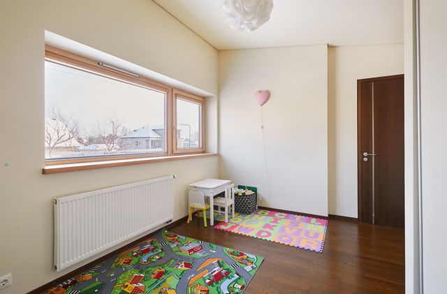 Įrengimas. Namo langai, lauko durys - medžio masyvo su stiklo paketais, svetainėje - vitrininiai. Sienos dažytos, tapetuotos. Grindų danga – klijuoto medžio parketas, plytelės. Elektros instaliacija – išskirstyta zonomis, įrengta signalizacija, priešgaisriniai davikliai. Namas pilnai įrengtas – atitinkant poreikius galima iškarto gyventi be papildomų investicijų. Savininkai palieka name esančius visus kietuosius ir minkštuosius baldus, bei buitinę techniką – kaitlentę, orkaitę, šaldytuvą, skalbyklę, džiovyklę, indaplovę. Name sumontuotas centrinis dulkių siurblys, kuris visas siurbliuojamas dulkes nukreipia į garaže esančią talpą (šiuo metu sistemą reiktų atnaujinti).