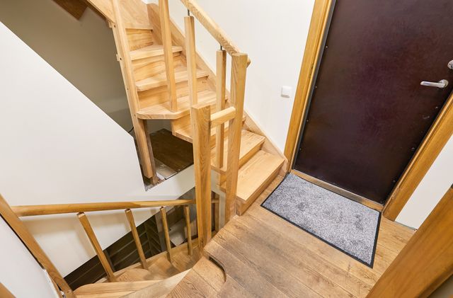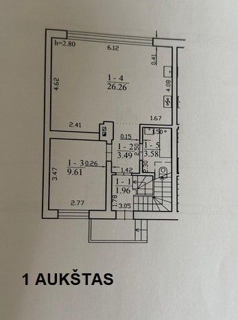 Pirmame aukšte: svetainė sujungta su virtuve – 26 kv. m., miegamasis 9,61 kv.m., sanmazgas – 3,58 kv. m.,